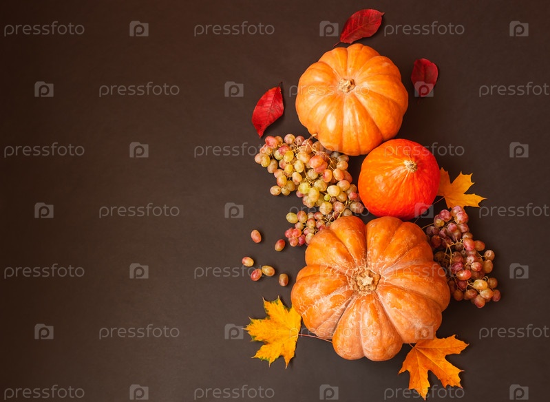 Граница из тыквы, осенних листьев и винограда на темном фоне