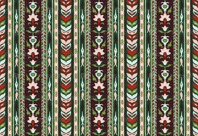 Геометрический дамасский орнамент. Икат границы. Этническая вышивка с листьями и монограммами. Племенная векторная текстура. Бесшовный народный узор в ацтекском стиле. Индийский, скандинавский, цыганский, мексиканский, африканский ковер