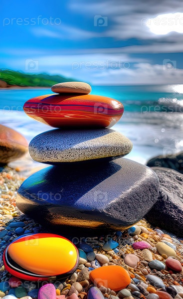 Абстрактный пейзаж с пирамидой из камней на фоне моря