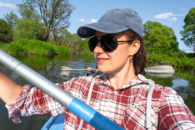 Пара мужчина и женщина, селфи счастливы в семейной прогулке на байдарках, гребной лодке по реке, водным походам, летним приключениям. Экологичный и экстремальный туризм, активный и здоровый образ жизни