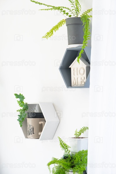 Полки на стене в виде сот с комнатными растениями в белом интерьере дома. Современный декор Комнатное растение уход за комнатным растением, зеленый дом