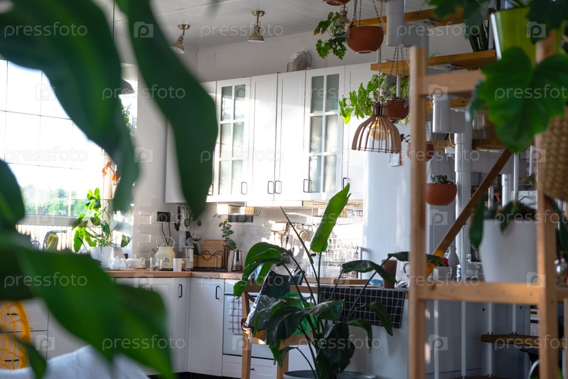 Интерьер белой кухни с металлической лестницей в коттедже с растениями в горшках в подвесных кашпо. Зеленый дом в современном стиле
