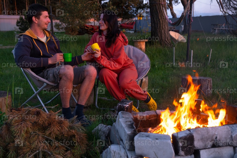 Влюбленная пара сидит у костра во дворе дома на кемпинговых стульях, романтический вечер. мужчина и женщина греют руки у костра, пьют чай
