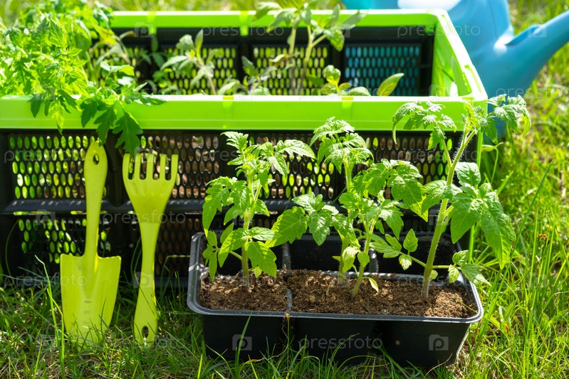 Рассада томатов в торфяных стаканах в ящике для посадки на грядку весной