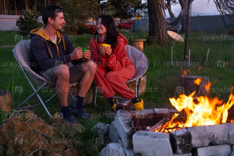 Влюбленная пара сидит у костра во дворе дома на кемпинговых стульях, романтический вечер. мужчина и женщина греют руки у костра, пьют чай