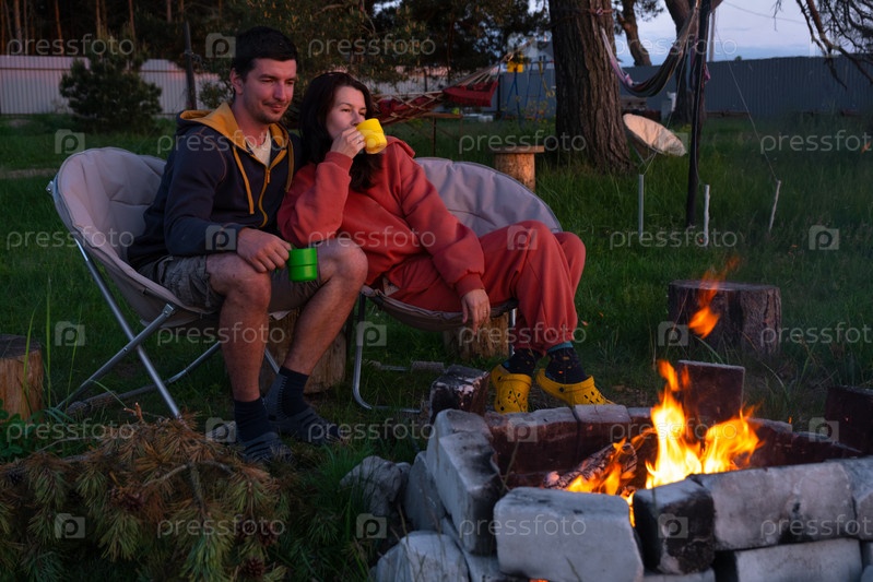 Влюбленная пара сидит у костра во дворе дома на кемпинговых стульях, романтический вечер. мужчина и женщина греют руки у костра, пьют чай