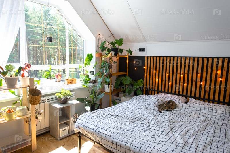 Домашняя кошка лежит на покрывале, моет лицо и лижет мех в интерьере спальни в стиле лофт, черная стена с деревянными планками, металлическая кровать, гирлянда из ретро-лампочек
