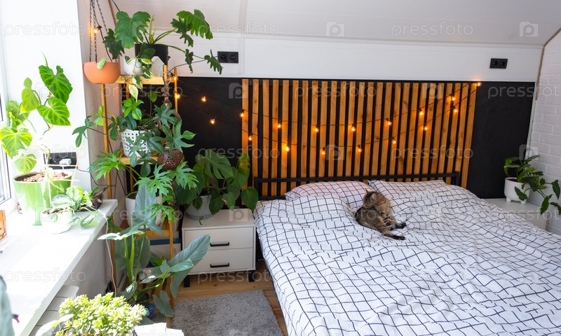Домашняя кошка лежит на покрывале, моет лицо и лижет мех в интерьере спальни в стиле лофт, черная стена с деревянными планками, металлическая кровать, гирлянда из ретро-лампочек