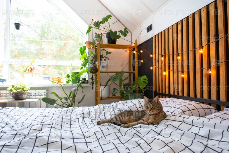 Домашняя кошка лежит на покрывале, моет лицо и лижет мех в интерьере спальни в стиле лофт, черная стена с деревянными планками, металлическая кровать, гирлянда из ретро-лампочек