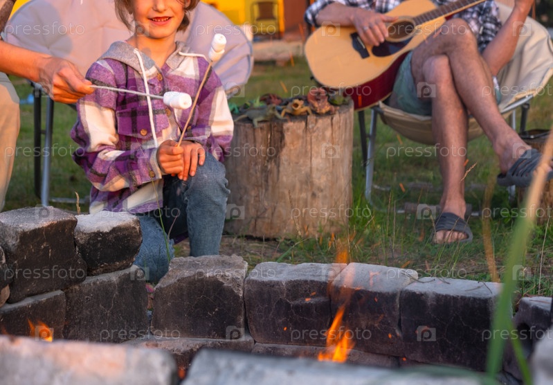 Девушка в клетчатой рубашке жарит зефир на костре во дворе дома, отец играет на гитаре. Вечерние семейные посиделки у костра, пикник на природе в туристических креслах