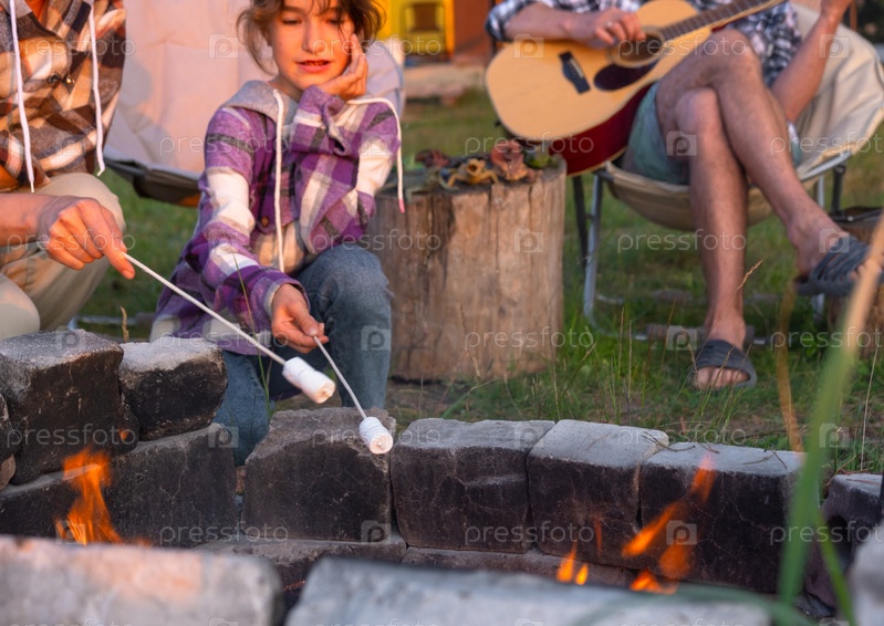 Девушка в клетчатой рубашке жарит зефир на костре во дворе дома, отец играет на гитаре. Вечерние семейные посиделки у костра, пикник на природе в туристических креслах