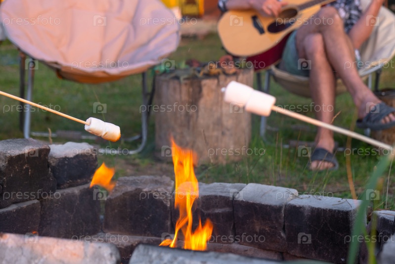 Девушка в клетчатой рубашке жарит зефир на костре во дворе дома, отец играет на гитаре. Вечерние семейные посиделки у костра, пикник на природе в туристических креслах