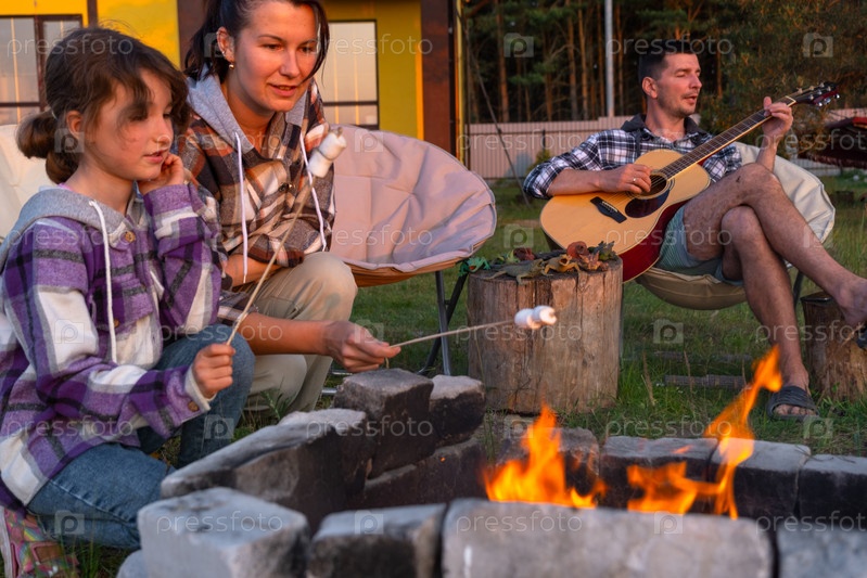 Девушка в клетчатой рубашке жарит зефир на костре во дворе дома, отец играет на гитаре. Вечерние семейные посиделки у костра, пикник на природе в туристических креслах