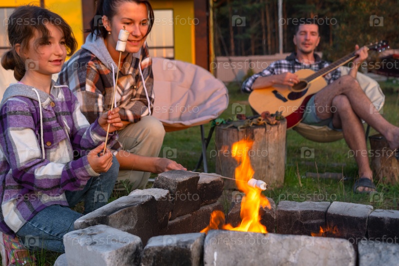 Девушка в клетчатой рубашке жарит зефир на костре во дворе дома, отец играет на гитаре. Вечерние семейные посиделки у костра, пикник на природе в туристических креслах