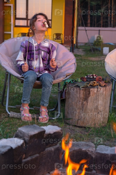 Девушка в клетчатой рубашке жарит зефир на костре во дворе дома. Вечерние семейные посиделки у костра, шезлонги на свежем воздухе
