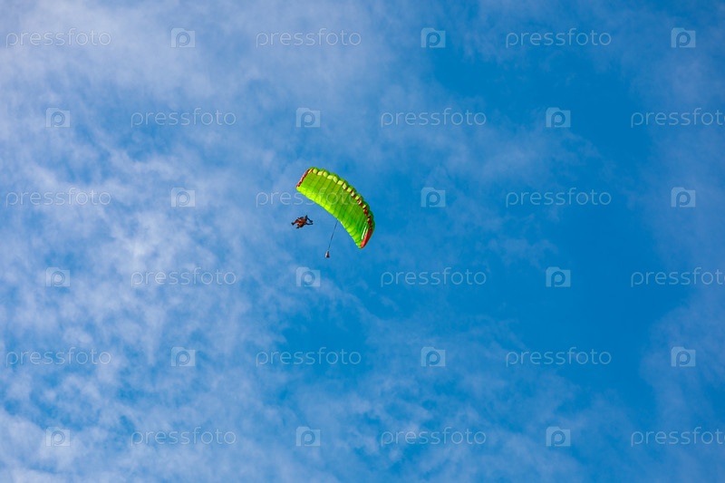 Парашют в небе. Тандем двух парашютистов летит на парашюте в голубом небе. Фото высокого качества