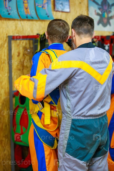 Инструктор затягивает лямки парашютного костюма. Фото высокого качества