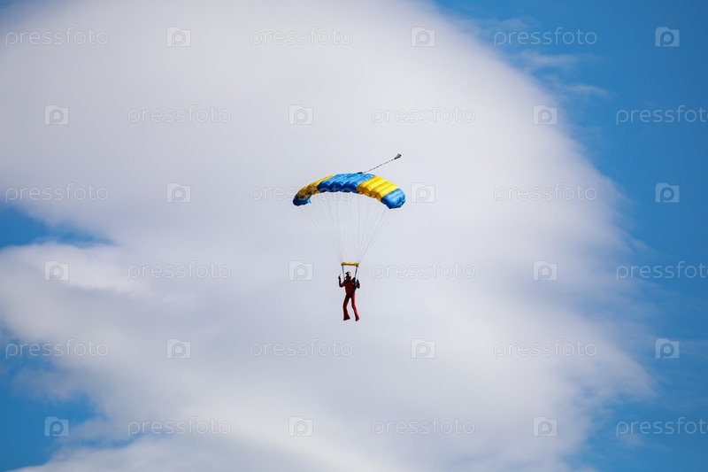 Парашют в небе. Парашютист летит на парашюте в голубом небе. Фото высокого качества