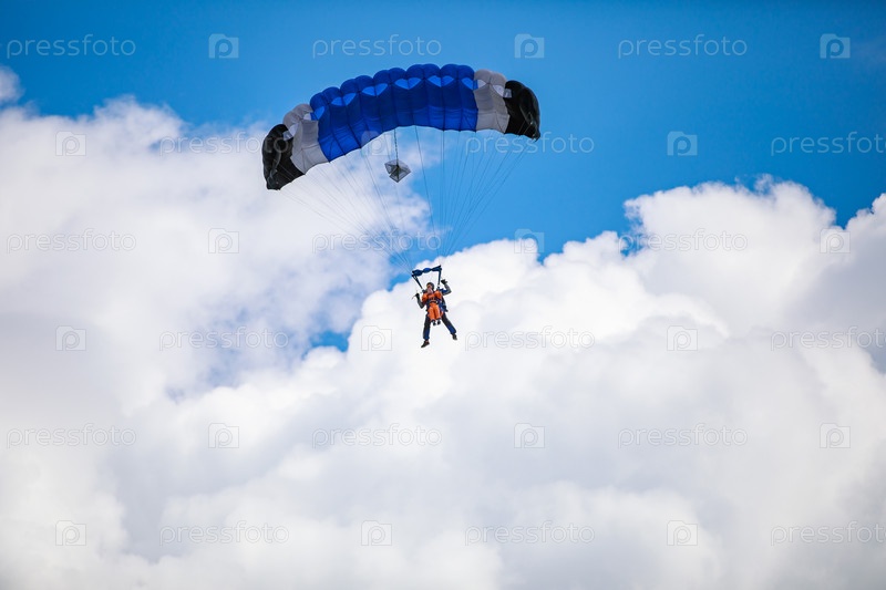 Парашют в небе. Парашютист летит на парашюте в голубом небе. Фото высокого качества