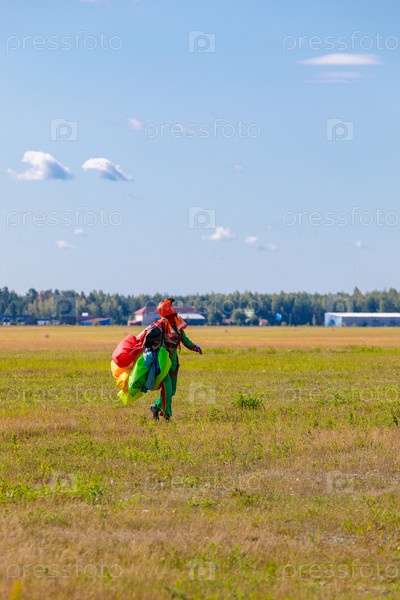 Женщина-парашютист ходит по полю с парашютом