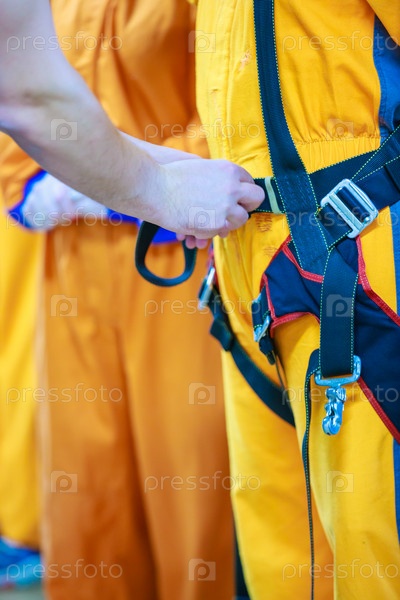 Инструктор затягивает лямки парашютного костюма