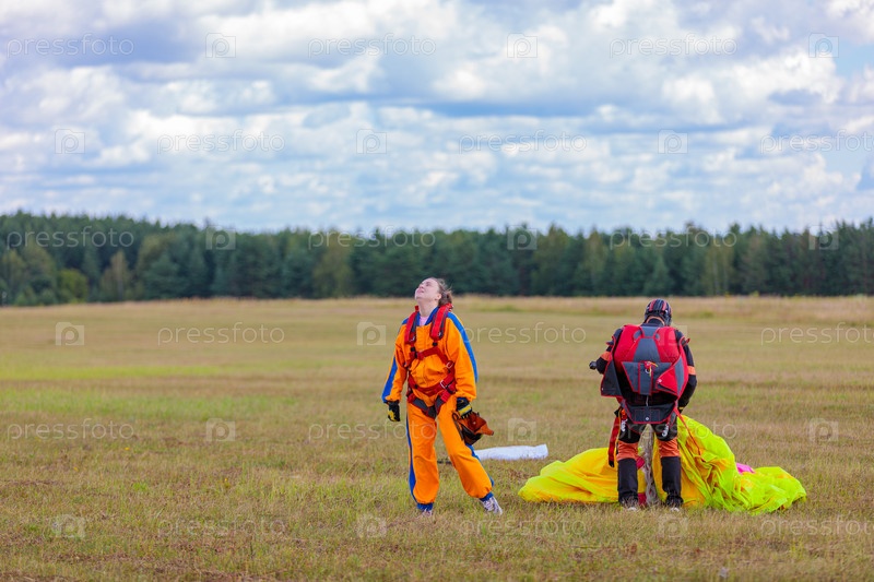 Парашютисты-спортсмены идут с парашютом после прыжка. Фото высокого качества