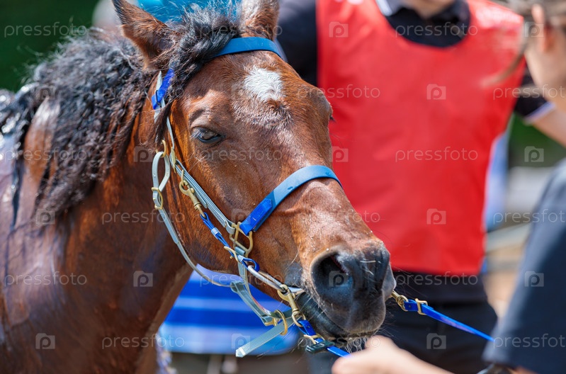 Портрет лошади на соревнованиях после забега. Фото высокого качества
