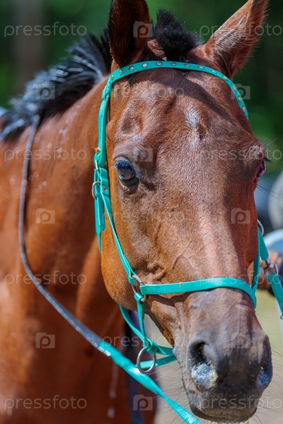 Портрет лошади на соревнованиях после забега. Фото высокого качества