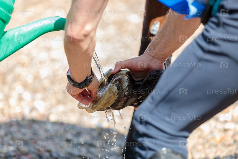 Мужчина чистит копыта спортивной лошади. Крупный план. Фото высокого качества