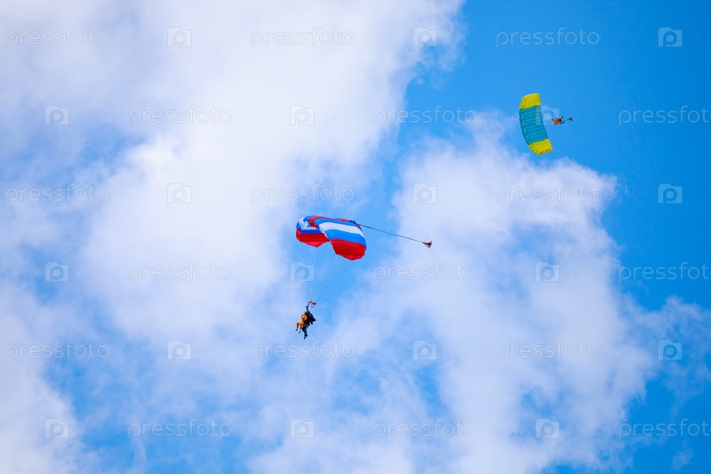Парашют в небе. Парашютист летит на парашюте в голубом небе