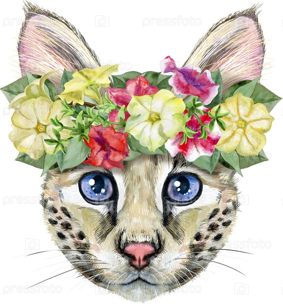 Симпатичный кот в венке из цветов. Кот для графики на футболках. Акварельная иллюстрация кошки Саванны