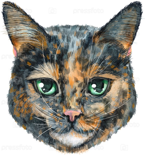 Прекрасный портрет крупным планом в пастельных тонах короткошерстной черепаховой кошки. Ручной обращается акварель на белом фоне
