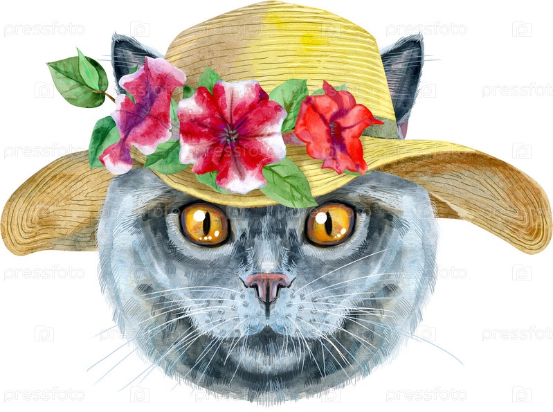 Милый кот в летней шапке с цветами. Кот для графики на футболках. Акварельная британская короткошерстная иллюстрация