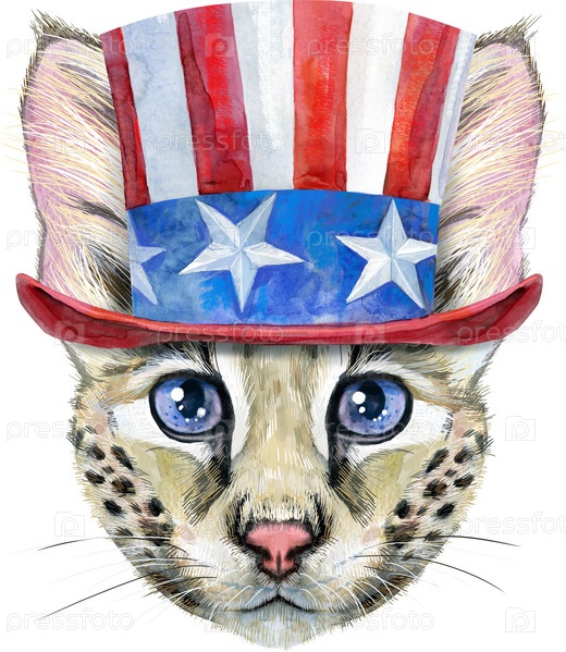 Прекрасный портрет крупным планом Кот Саванны в шляпе дяди Сэма. Ручной обращается акварель на белом фоне