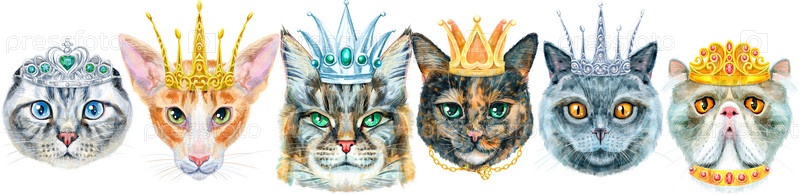 Граница портретов кошек разных пород в коронах. Акварель рисованной иллюстрации