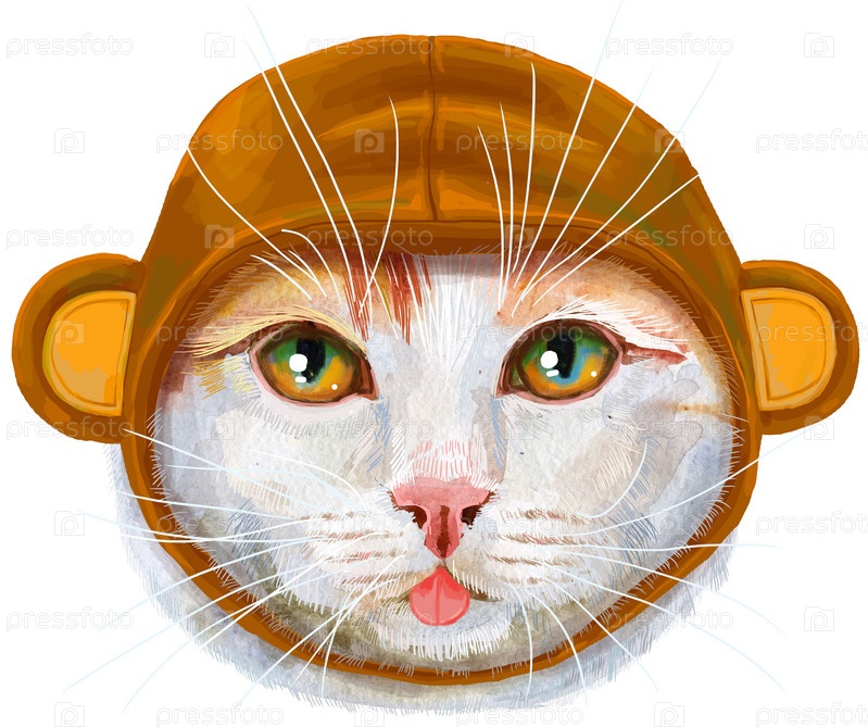 Прекрасный портрет крупного плана турецкого ванского кота в костюме обезьяны с ушами. Ручной обращается акварель на белом фоне