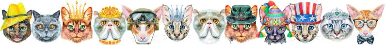 Граница портретов кошек разных пород с аксессуарами. Акварель рисованной иллюстрации