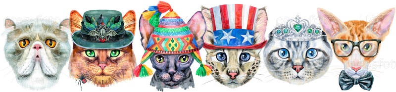 Граница портретов кошек разных пород с аксессуарами. Акварель рисованной иллюстрации