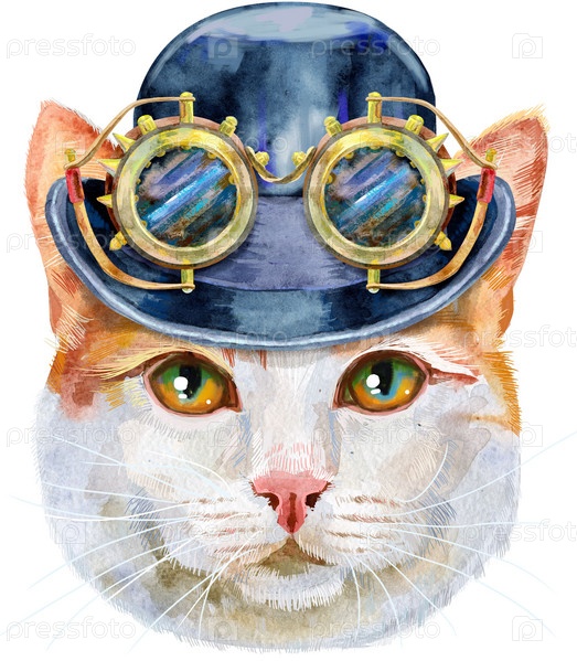 Прекрасный портрет крупного плана турецкого фургонного кота в котелке с очками в стиле стимпанк. Ручной обращается акварель на белом фоне