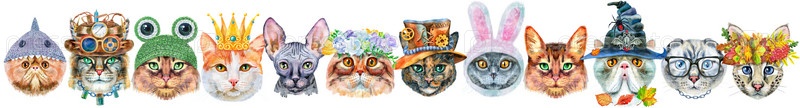 Граница портретов кошек разных пород с аксессуарами. Акварель рисованной иллюстрации