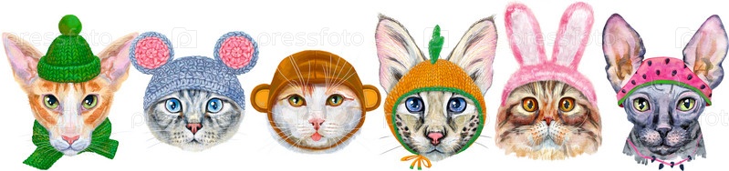 Граница портретов кошек разных пород. Акварель рисованной иллюстрации