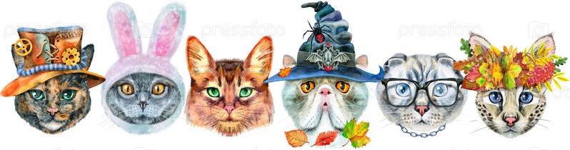 Граница портретов кошек разных пород с аксессуарами. Акварель рисованной иллюстрации