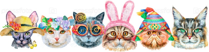 Граница портретов кошек разных пород с аксессуарами. Акварель рисованной иллюстрации