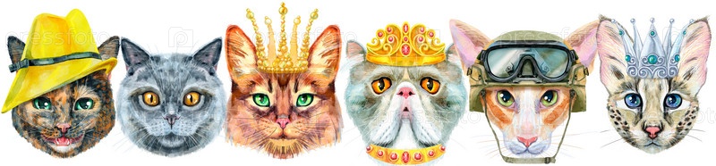 Граница портретов кошек разных пород с аксессуарами. Акварель рисованной иллюстрации
