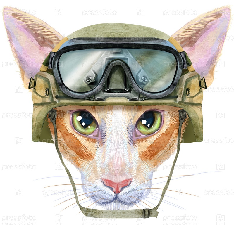 Прекрасный портрет крупным планом восточная кошка в военном тактическом шлеме с очками. Ручной обращается акварель на белом фоне