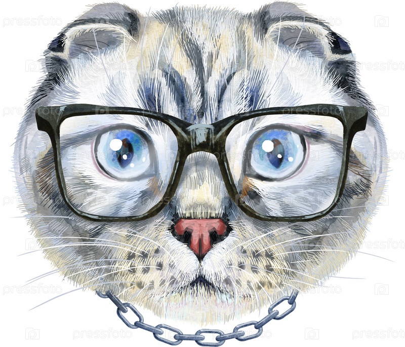Симпатичный кот в больших черных очках и с цепочкой на шее. Кот для графики на футболках. Акварель шотландская вислоухая иллюстрация породы кошек