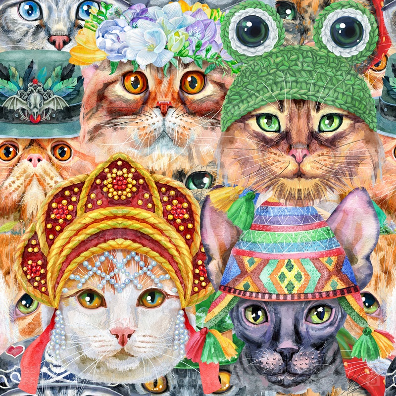 Бесшовный узор из кошек. Кошки для графики на футболках. Акварельные иллюстрации кошек. Акварель рисованной иллюстрации