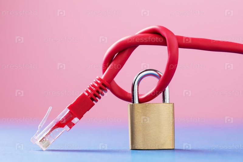 Закрытый замок на сетевом проводе, завязанном узлом, концепция безопасности компьютерных сетей