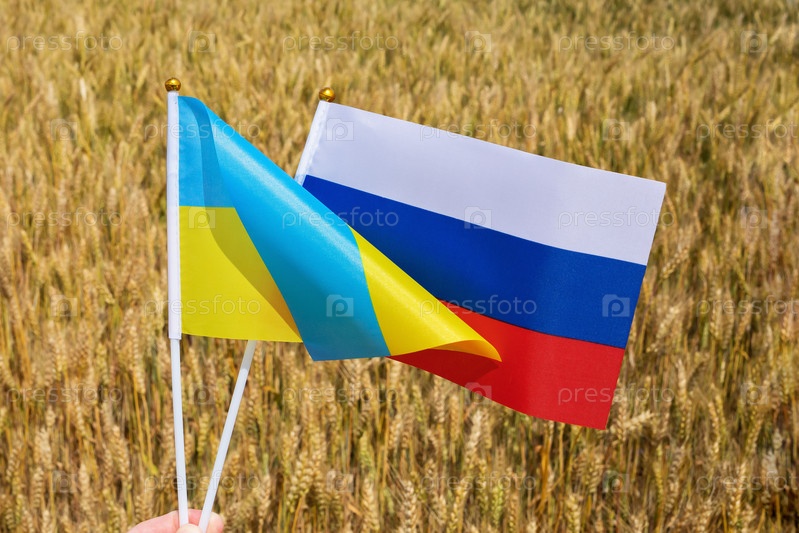 Два флага в руках на фоне поля с пшеницей, концепция на тему зерновой сделки между Украиной и Россией