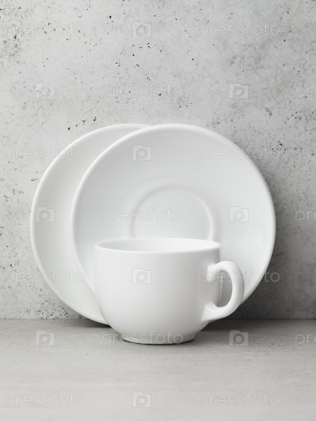 Два белых керамических блюдца и одна чашка на столе